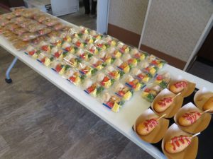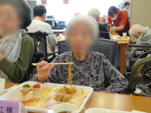 焼きそばやお好み焼き、フランクフルト、おむすび等、お祭りの屋台に出るような普段と違うお食事がたくさん並んでいます。
