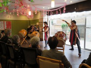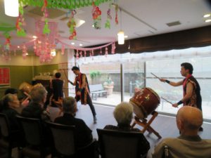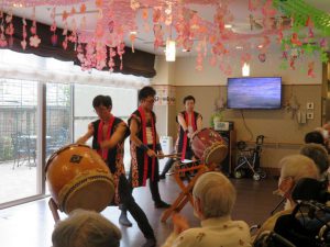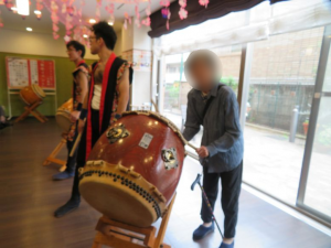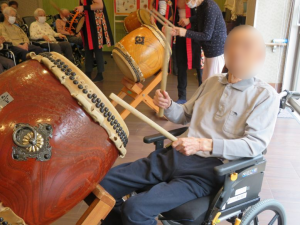 また、最後はご入居者様に和太鼓の体験もしていただきました。