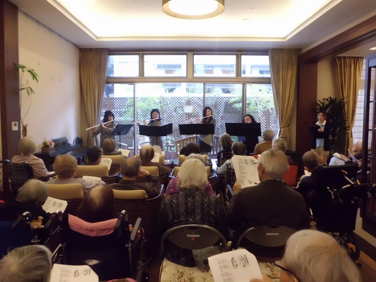 大人気の曲をたくさんご用意していただき、華やかなフルートの伴奏に合わせて、皆様心地よくお歌を楽しまれていらっしゃいました。